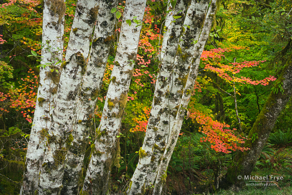 So here’s another collection of fall-color photos from the Olympic Peninsula. Most of these include either alder trunks or water. And as I mentioned in my previous post, I’m always looking for patterns and focal points in my compositions – especially with complex forest scenes. See if you can spot them!
