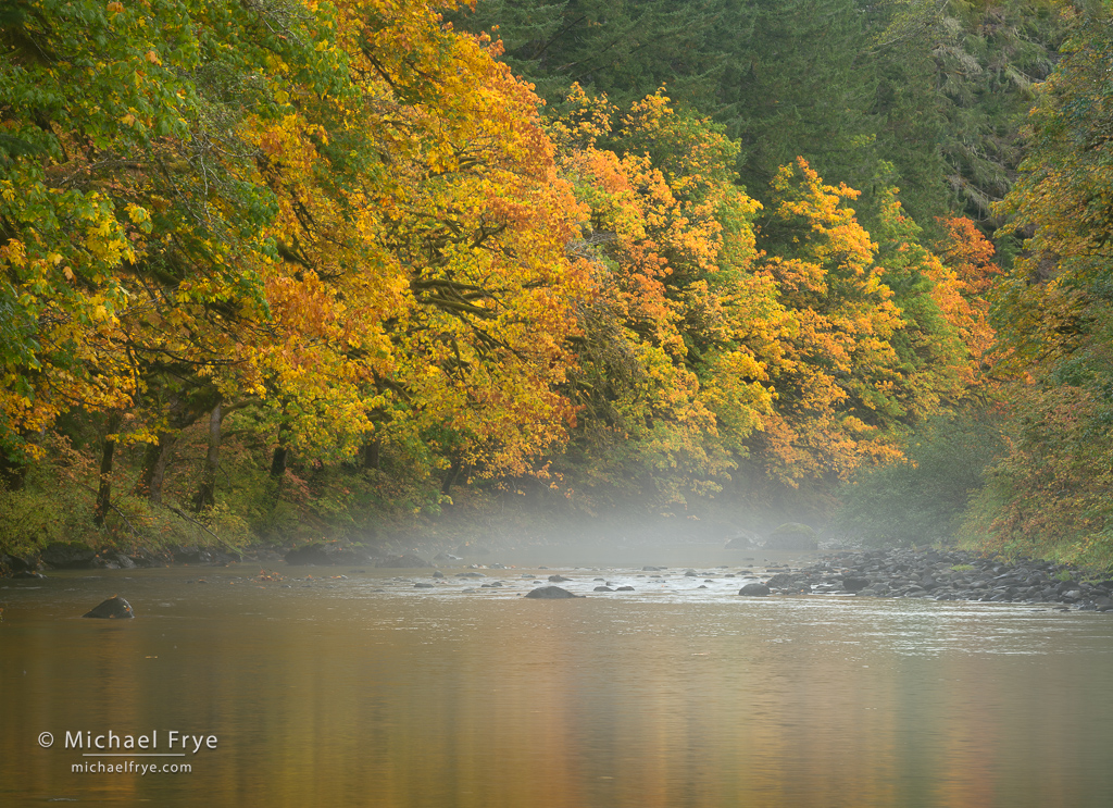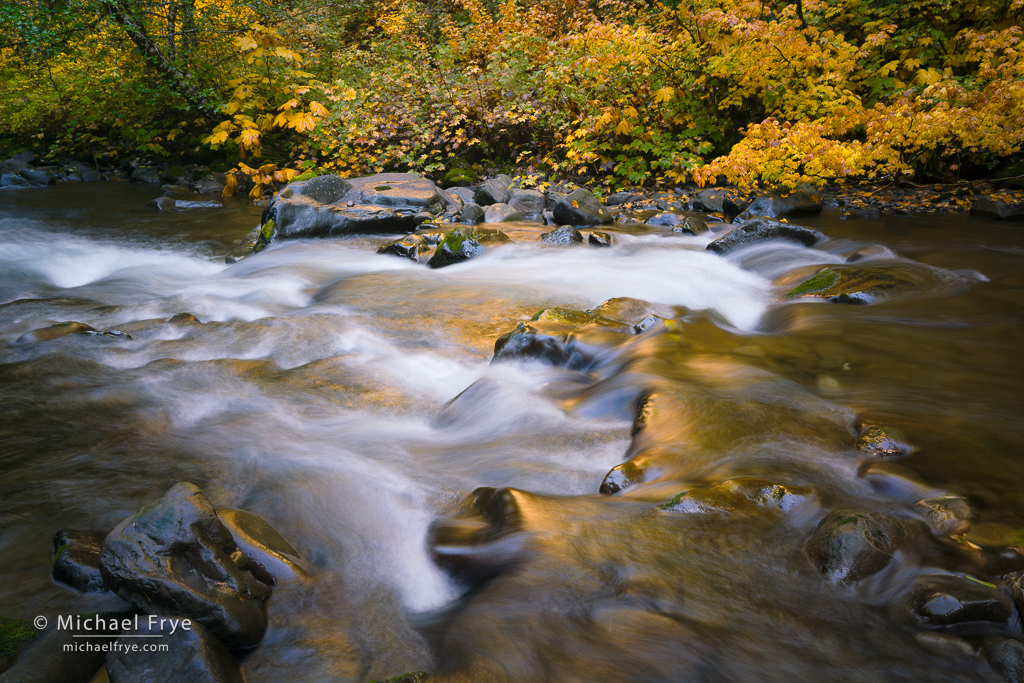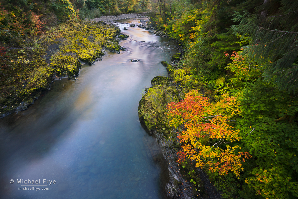 And I also looked for color along creeks and riverbanks. Of course in the Pacific Northwest the creeks and riverbanks are usually choked with vegetation, making it hard to even get near them. And when I did manage to work my way down to the water’s edge, the view of a tree-lined river I was hoping to find was usually blocked by… trees. But I did find a few good vantages.