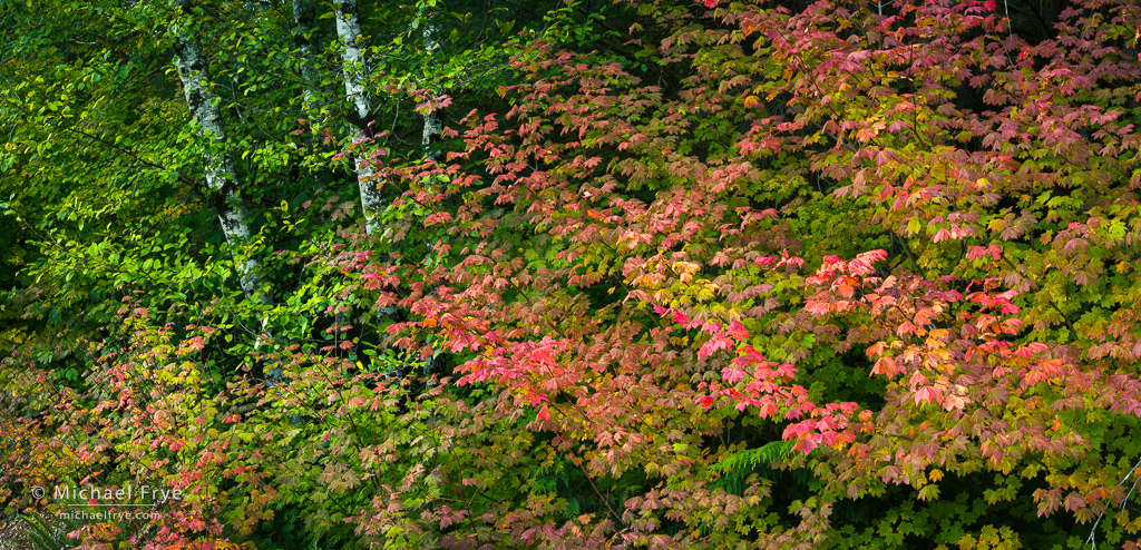 One thing I kept looking for was groves of alders. Alders often form great patterns, with leaning, criss-crossing, light-colored trunks spotted with patches of moss or lichen. But while alders are deciduous trees, their leaves don’t turn color in the fall. Alders just drop their leaves while they’re still green. Even without that color, however, their patterns and structure make them worth photographing, and sometimes (like in the photo above) I was able to juxtapose maples with alder trunks. (Why don’t alder leaves turn color? No one really knows, but here’s one possible explanation.)