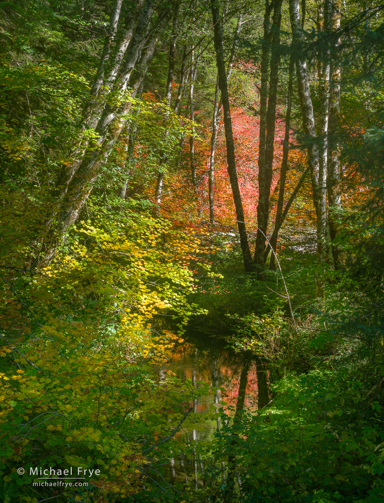 And I also looked for color along creeks and riverbanks. Of course in the Pacific Northwest the creeks and riverbanks are usually choked with vegetation, making it hard to even get near them. And when I did manage to work my way down to the water’s edge, the view of a tree-lined river I was hoping to find was usually blocked by… trees. But I did find a few good vantages.