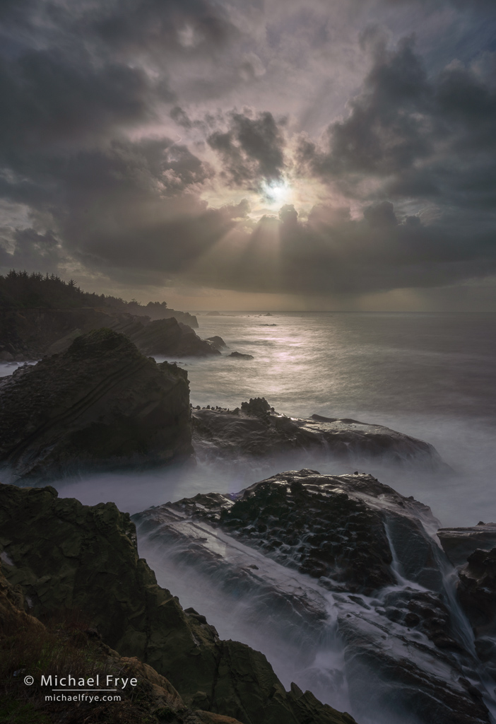 Sunbeams along a rocky coastline, Oregon Coast. 22mm, three exposures blended by hand in Photoshop (water at 15 seconds), f/16, ISO 100, ND filter.