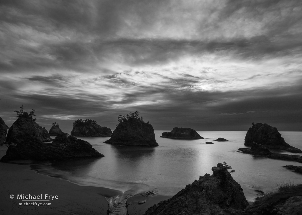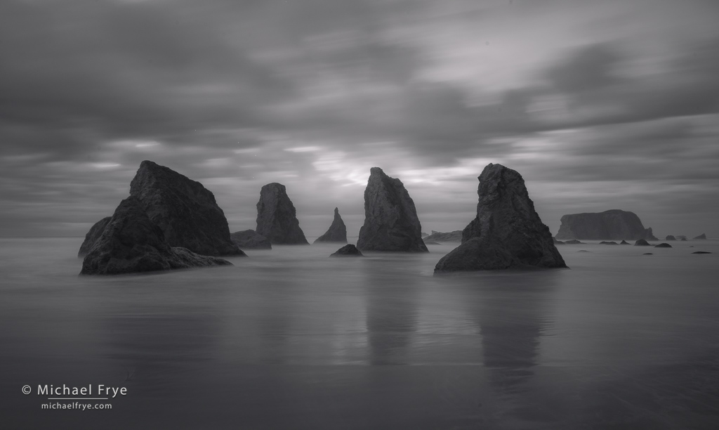 Clouds and sea stacks, Oregeon Coast. 18mm, three exposures blended by hand in Photoshop (water at 8 seconds), f/16 ISO 100, ND filter.