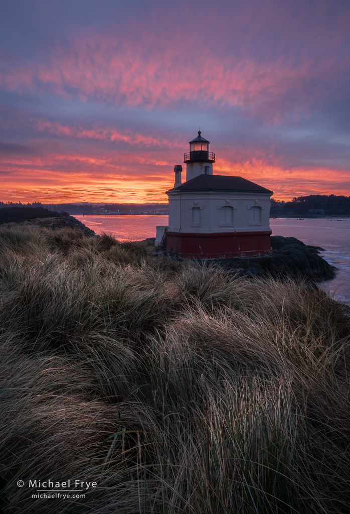 Lighthouse at sunrise, Oregon. 23mm, three exposure ranging from 1/10 sec. to 1.5 seconds, blended with Lightroom’s HDR Merge, f/16, ISO 100, no ND filter.
