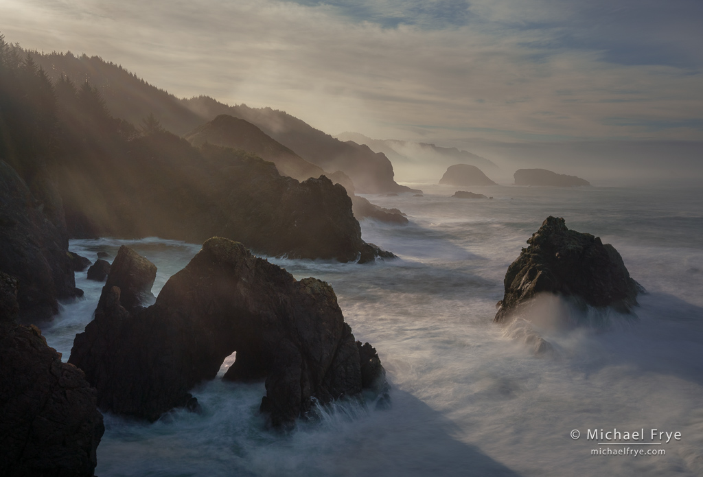 I made the photo above on the first evening of our workshop. The light was amazing, with warm, late-day sunlight cutting through the low-level mist along the shore. We saw some fairly big wave splashes at times, but I decided to use a slow shutter speed (8 seconds), as I thought softening the texture of the water would add to the ethereal mood of the scene. I like the soft-on-soft effect, with a few rocks catching the light and adding a contrasting note of hardness and solidity.