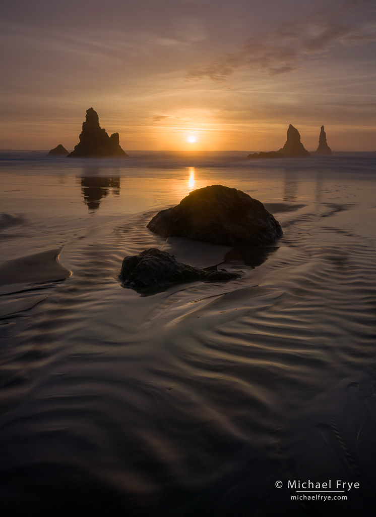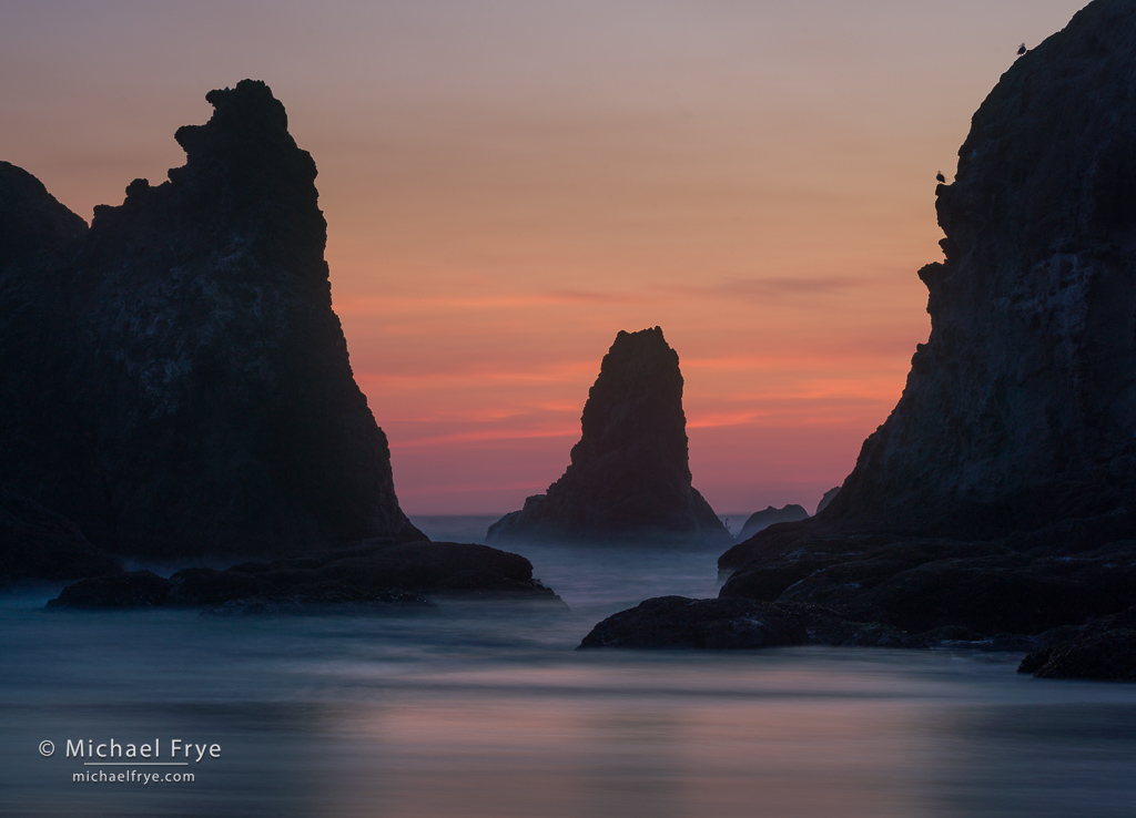 Rocks and setting sun, Oregon Coast. 28mm, three exposures blended by hand in Photoshop (water at 15 seconds), f/16, ISO 100, ND filter.