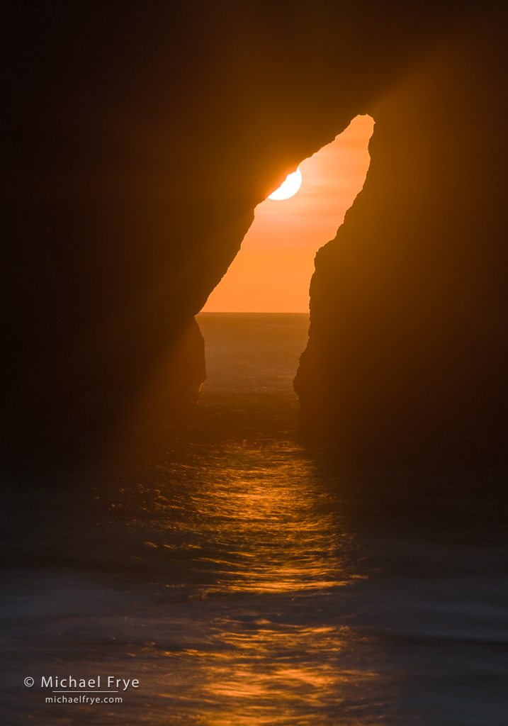 Sun setting through an arch, Oregon Coast. 232mm, three exposures ranging from 1/3 sec. to 6 seconds, blended with Lightroom’s HDR Merge, f/16, ISO 100, ND filter.