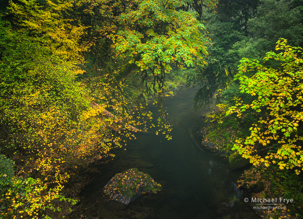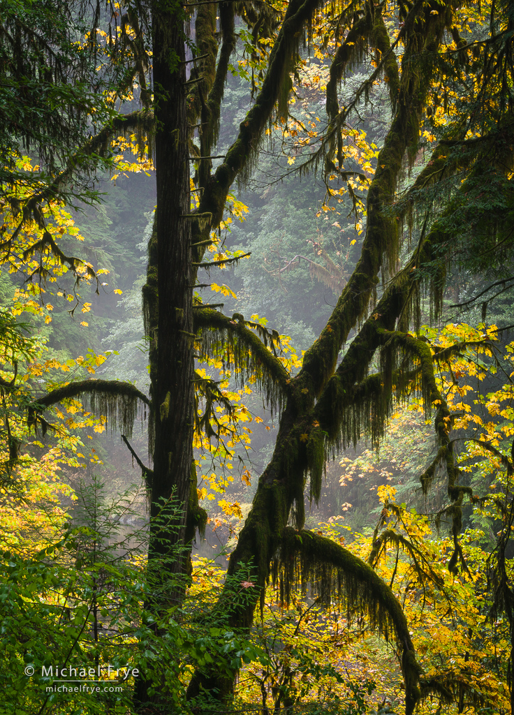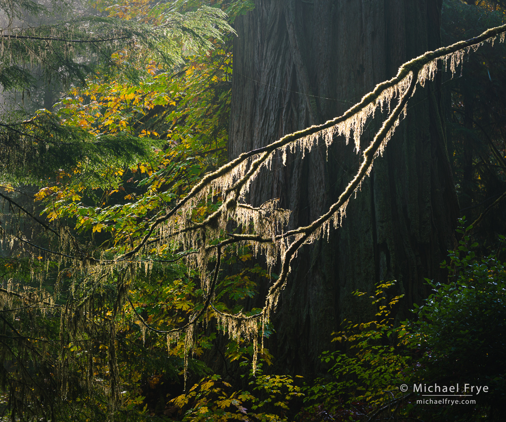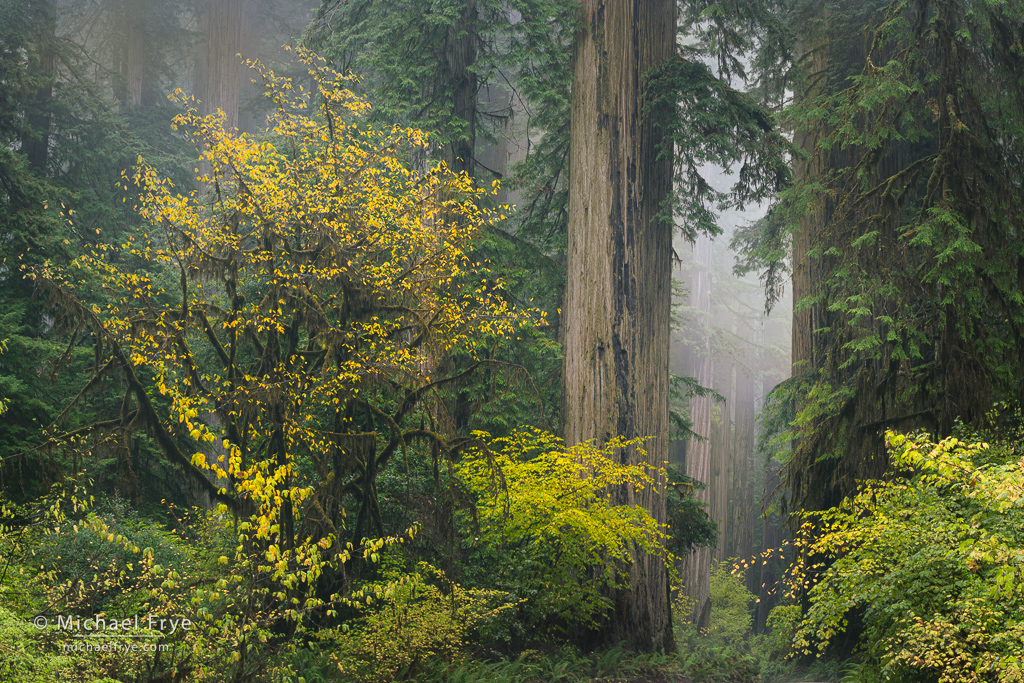 I had long wanted to photograph fall color in the redwoods, but it’s difficult to find the right conditions, especially since the best groves are a nine-hour drive from home. Some years the big-leaf maples just turn brown. And even if they do turn yellow the timing is highly variable. So we felt very lucky to find some good color this year.