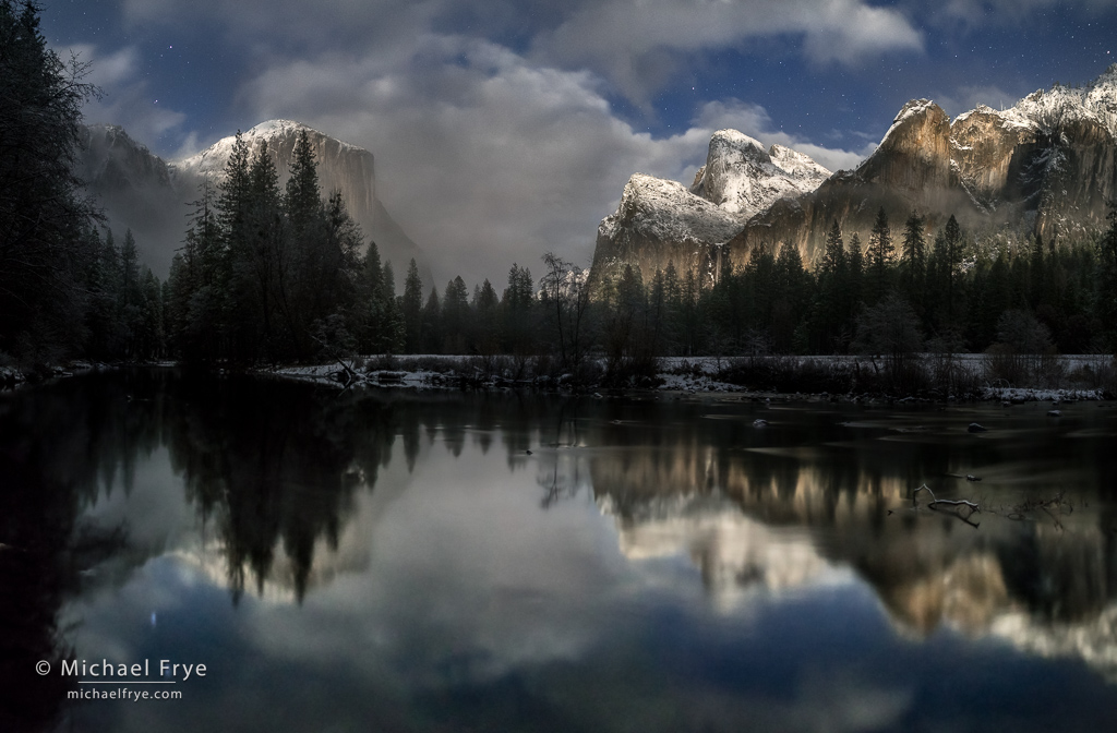 Thinking about that night brings back some great memories. A winter storm started clearing around 9:00 p.m., so I headed up to Yosemite Valley, knowing that the two-thirds full moon was due to set at 1:45 a.m., and as it sank I might find some beautiful, low-angle moonlight to go along with that clearing storm.