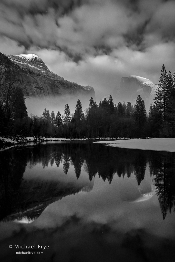 Thinking about that night brings back some great memories. A winter storm started clearing around 9:00 p.m., so I headed up to Yosemite Valley, knowing that the two-thirds full moon was due to set at 1:45 a.m., and as it sank I might find some beautiful, low-angle moonlight to go along with that clearing storm.