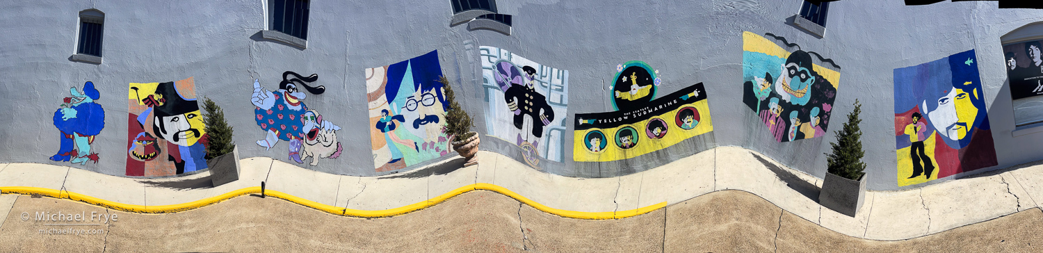 Distorted iPhone panorama of murals on Abbey Road, Walnut Ridge, Arkansas. In 1964 the Beatles made a brief stop in this town, changing planes at the airport. The town commemorated the event by naming a street “Abbey Road,” where you can find these Yellow-Submarine-themed murals, along with other Beatles artwork. To make this image I walked down the street past the murals during the exposure, tilting the phone to get the wavy effect.