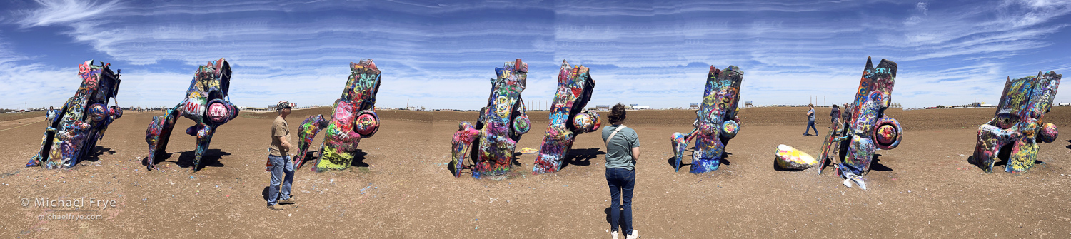 Distorted iPhone panorama of the Cadillac Ranch near Amarillo, Texas. Of course we had to stop at the Cadillac Ranch, since it’s right next to I-40. My last visit was in 1998, on an assignment for Texas Highways magazine. (You can find that photo on this page.)