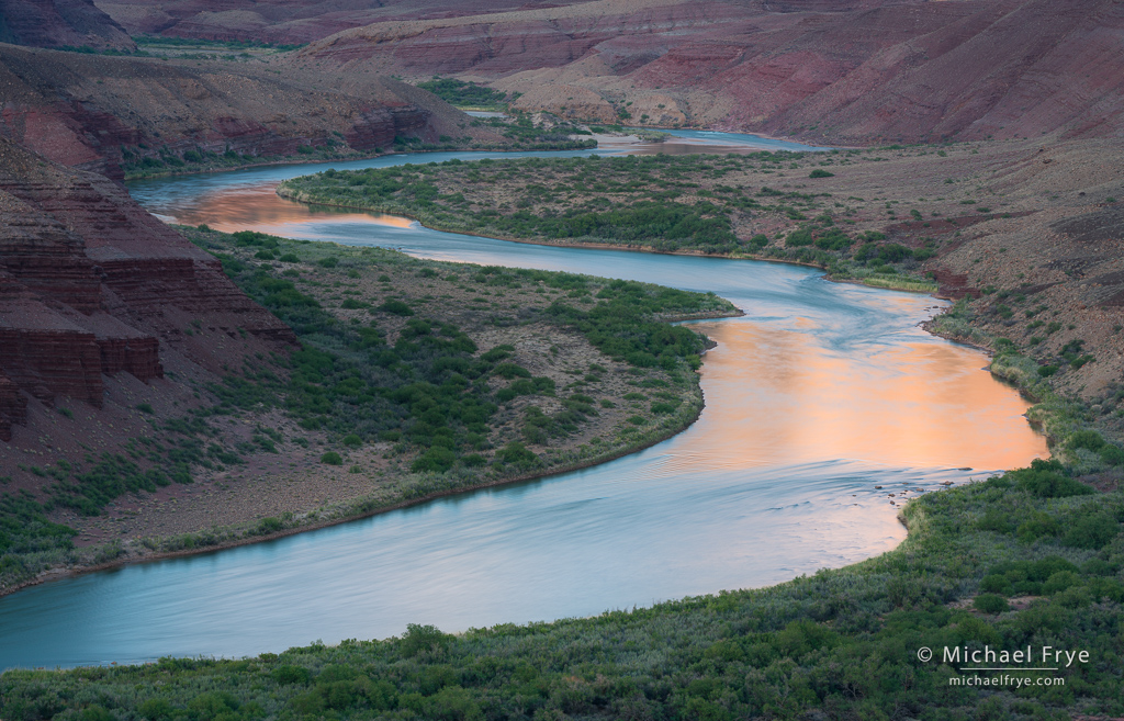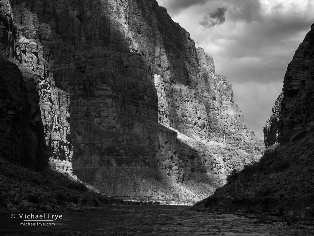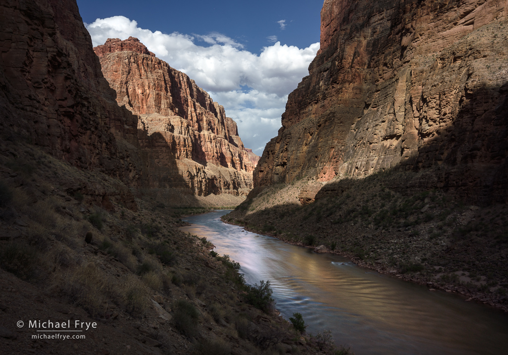 Dappled light above the Colorado River, Grand Canyon NP, Arizona. I used a neutral-density filter (probably seven stops) to slow the shutter speed to three seconds and smooth the water, and had to wait for moments when the wind was calm at the camera position, lest the wind vibrate the camera and blur the photo during the long exposure.