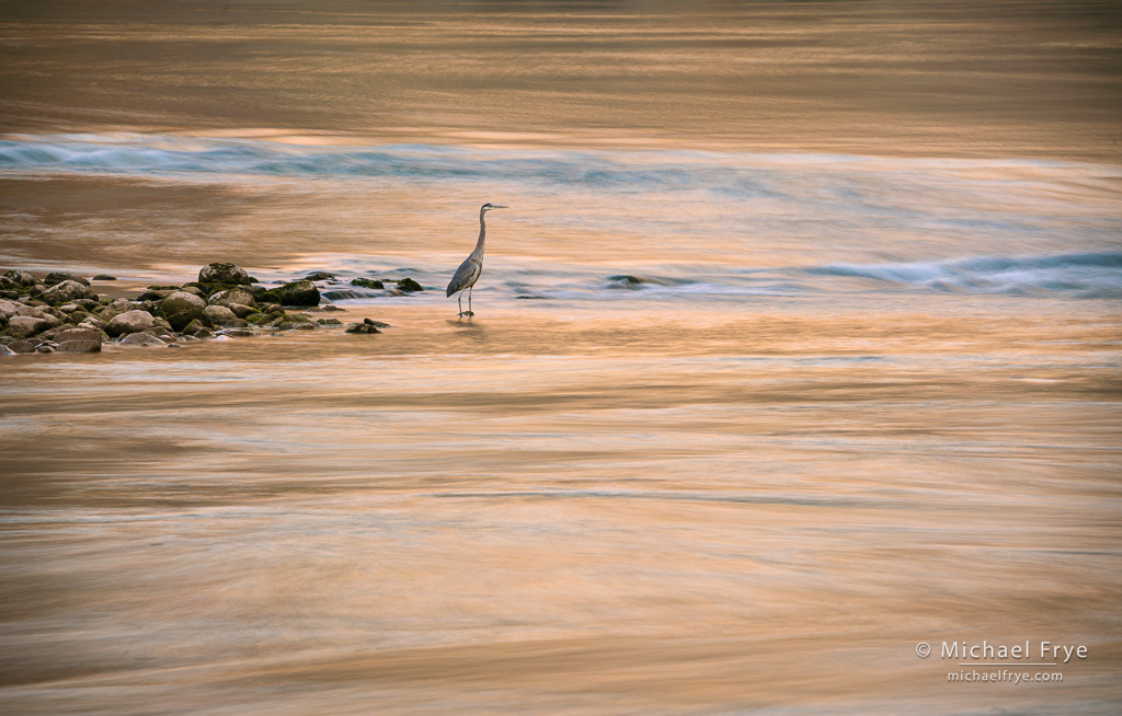 Great blue heron and reflections, Grand Canyon NP, Arizona. You might be able to see this bird in the center of the previous photo. When I noticed the heron I switched to my 100-400mm zoom, and used a neutral-density filter (probably seven stops?) to slow the shutter speed to three seconds, as I wanted the bird to be sharp but the water blurred around it. I made four exposures before the heron flew off, and luckily it held still long enough in a couple of them.