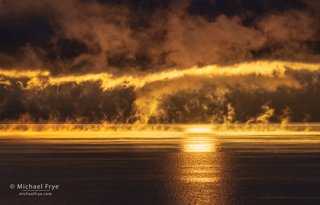 I’ve spent a lot of time around Mono Lake, but rarely seen extensive, low-level fog over the water. In February of 2023 we photographed Poconip fog there, but that was a thicker, persistent fog, where the sun struggled to break through, and then only late in the morning. This was different. We saw a large bank of low, broken clouds over much of the lake, but also tendrils of fog lifting off the surface.