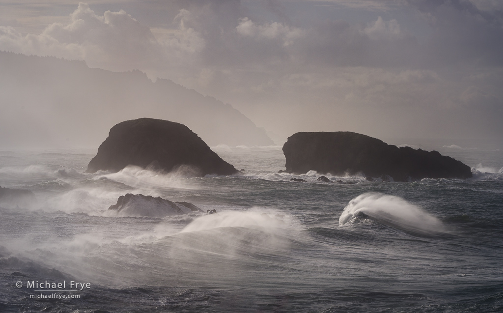 Waves, rocks, and clouds, Oregon Coast. Also from Monday morning, with beautiful rooster tails blowing off the tops of the waves. 126mm, 1/500 sec. at f/16, ISO 200.