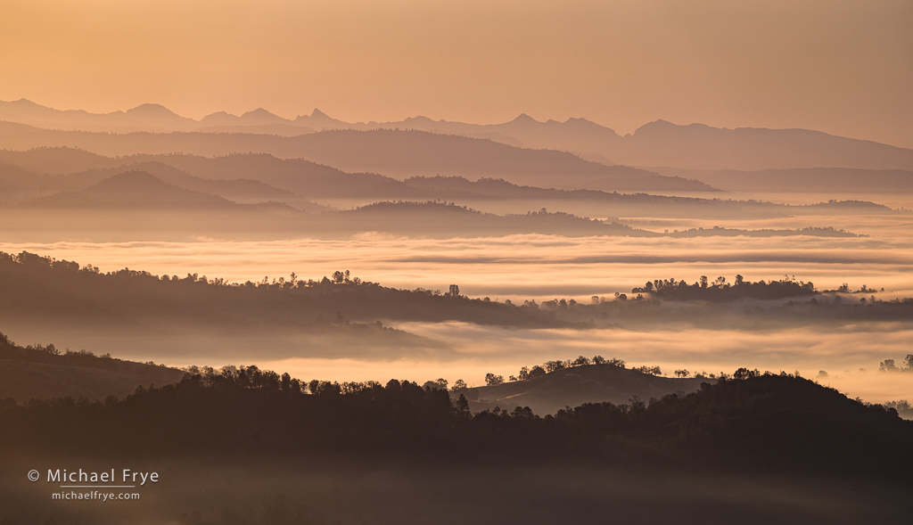 But it’s not easy to find the right view. There’s little public land in the Sierra foothills, so you’re usually restricted to photographing from public roads. And the fog has to be at the right level. Ideally I’d like to find a vantage point that’s just above the fog layer. If the fog is too high you’re in it, looking at pea soup. If it’s too low you won’t be able to see the fog at all, or only be able to see it off in the distance. And of course the fog layer rises and falls, so it’s hard to predict.