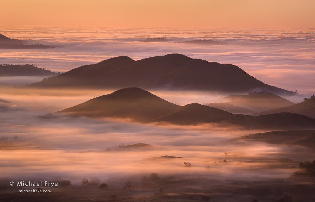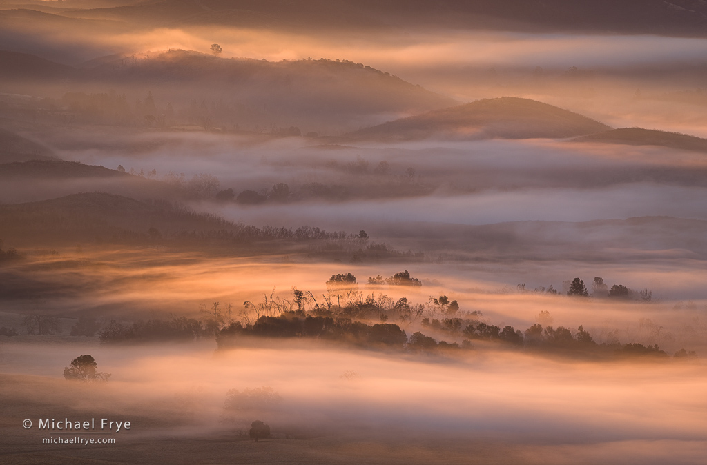 Layers of fog, sunrise, Sierra Nevada foothills, California. This is a tighter telephoto view, focused on an area slightly to the left of the previous image, and made less than a minute later. 400mm, 1/45 sec. at f/11, ISO 100.