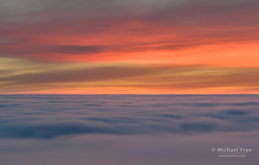 Fog over the Central Valley at sunset, Sierra Nevada foothills, California. I made this Wednesday evening, with just fog and clouds, and a neutral-density filter to show the shutter speed and soften the fog. 105mm, 30 seconds at f/11, I00, ND filter.