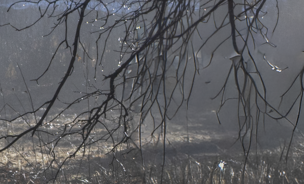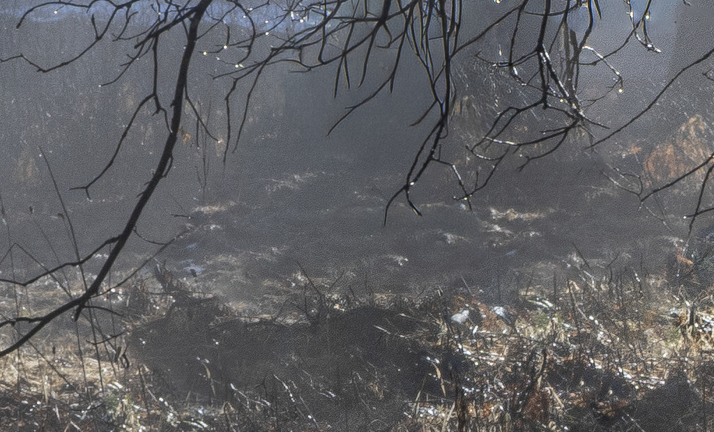 There’s a noticeable difference in sharpness between the un-retouched branches on the left side of this zoomed-in view, and the branches on the right side, where I used Generative Remove to replace the wire mesh. Adobe’s AI-powered retouching tools often generate low-resolution results.