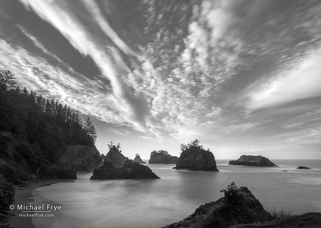 Clouds and sea stacks, Oregon Coast. We photographed a pretty sunrise from this spot, but soon thereafter even more interesting clouds moved in, creating a fan-shaped pattern in the sky. Without any wave action I opted for a slow shutter speed (20 seconds) to smooth the water.