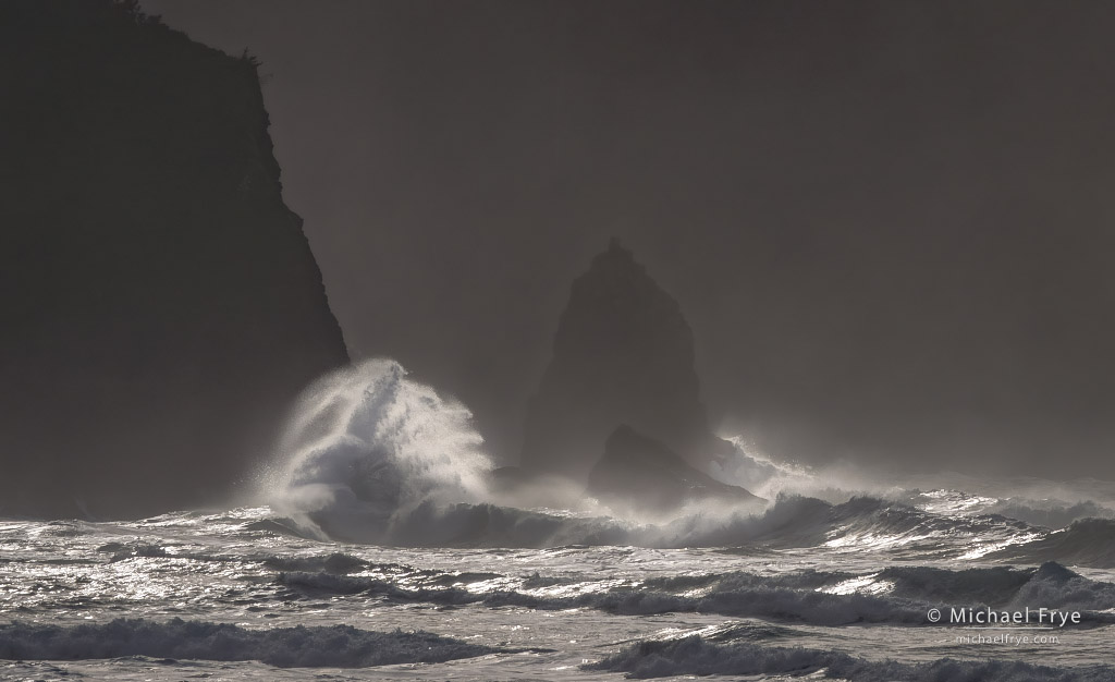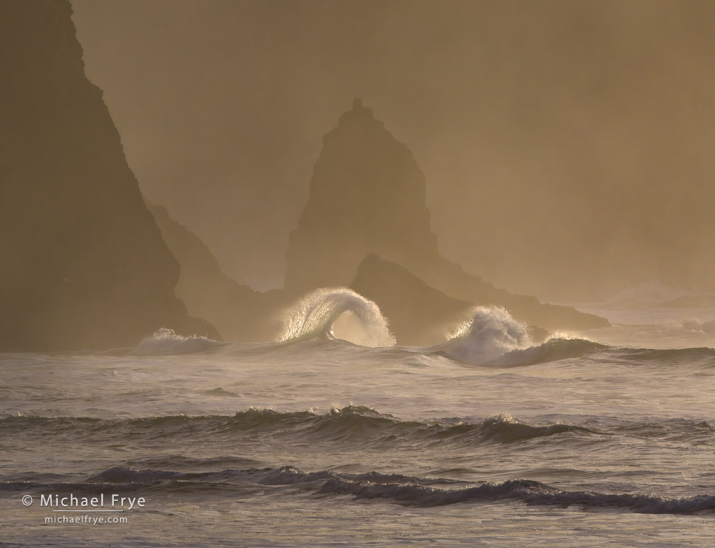 Waves, rocks, and fog, Oregon Coast. Here late-afternoon sunlight cutting through mist backlit the waves. Again I used a fast shutter speed (1/500 sec.) to freeze the motion and try to capture a moment with an interesting wave splash. This reverse-curling wave wasn’t the biggest splash I saw, but had a great shape.