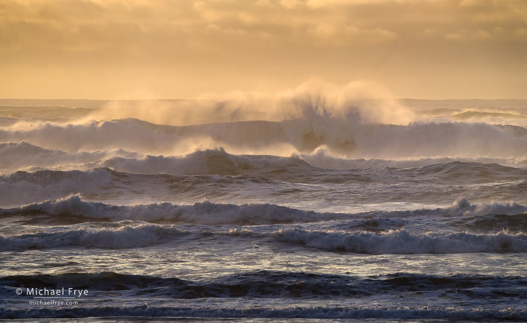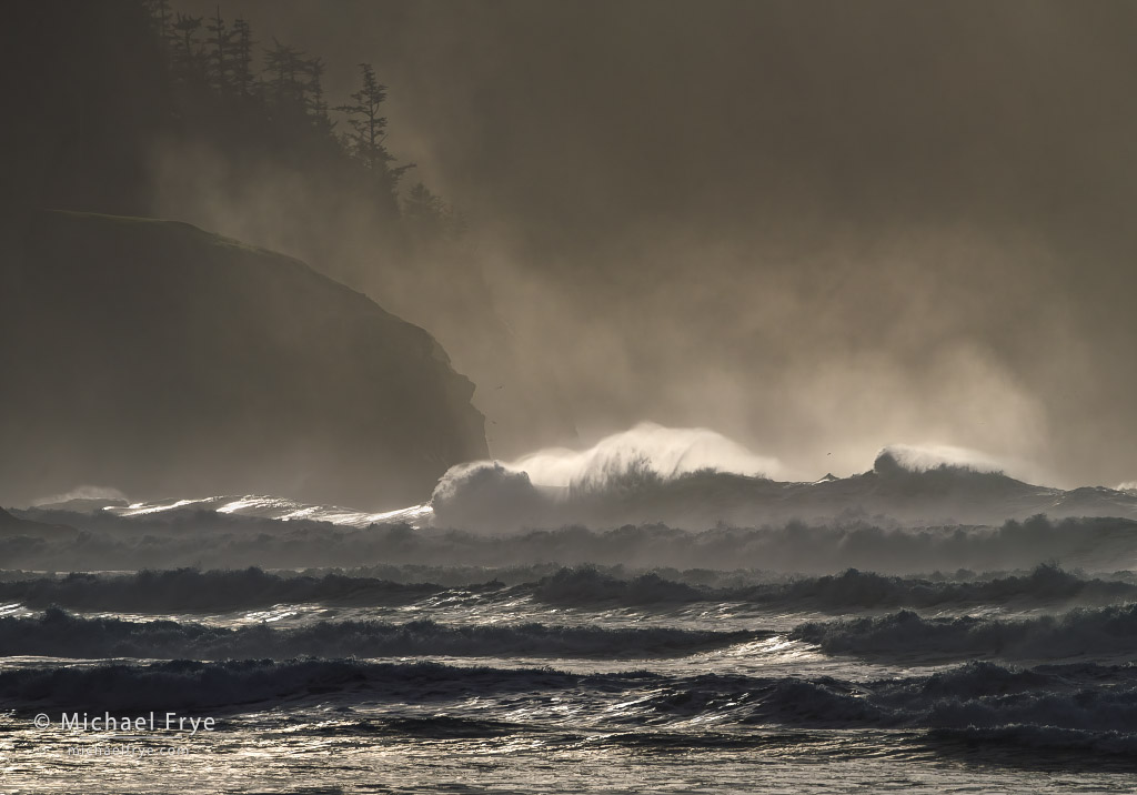 Breaking waves against a misty shoreline, Oregon Coast. I loved how the offshore breeze blew the tops of some of the breakers, so I zoomed in with a long lens (400mm) and used a fast shutter speed (1/500 sec.) to freeze the motion.