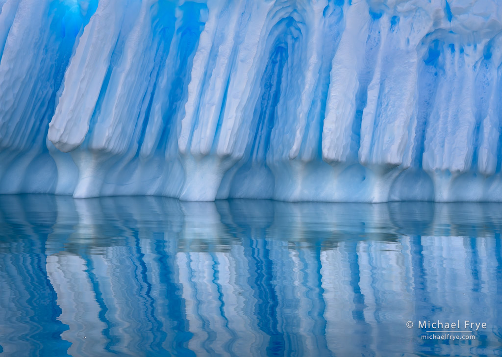 Ice columns and reflections, Antarctica. On a zodiac cruise in an icy bay we photographed humpback whales for awhile at close range. Then we turned our attention to the icebergs, and found some beautiful patterns. This iceberg was next to the one at the top of this post.