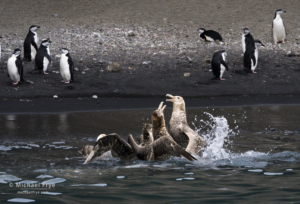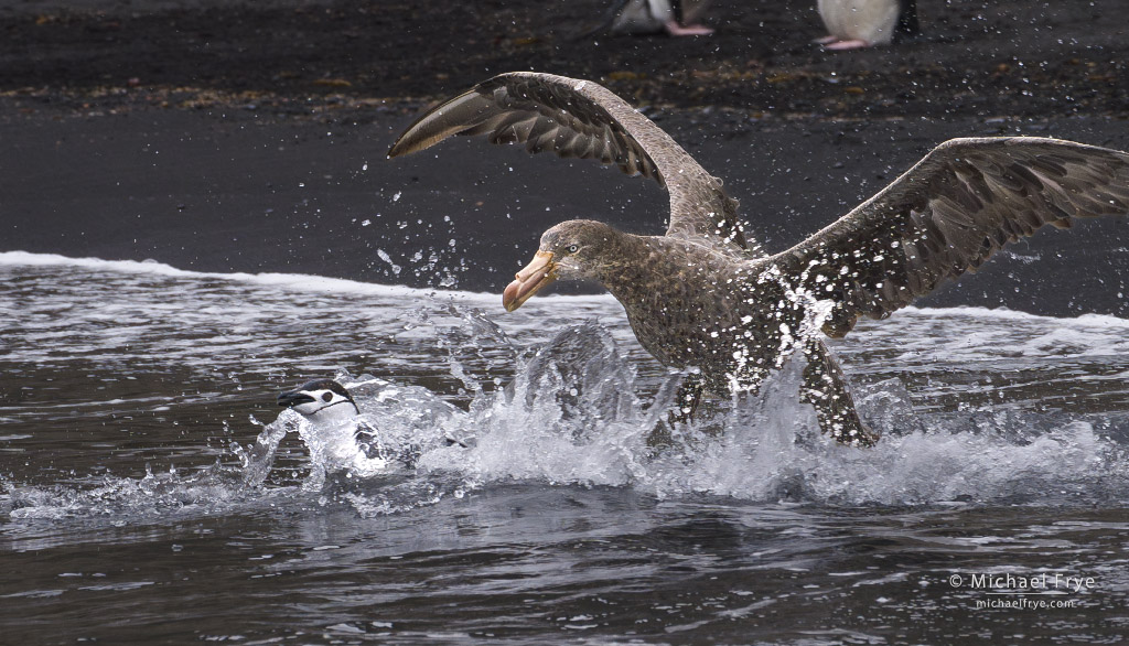 Few animals can adapt to Antarctica’s extreme climate, but those that do are remarkable creatures. Penguins have given up the ability to fly in order to increase their aquatic agility. They’re superb swimmers, which allows them to efficiently feed on the abundant marine life in Antarctica (especially krill), yet they can still nest on land in relative safety because there are no land mammals to prey on them. But wherever there’s a potential food source someone will find a way to exploit it, so the giant petrels have learned to hunt penguins, with some success. It was fascinating to watch this in action.