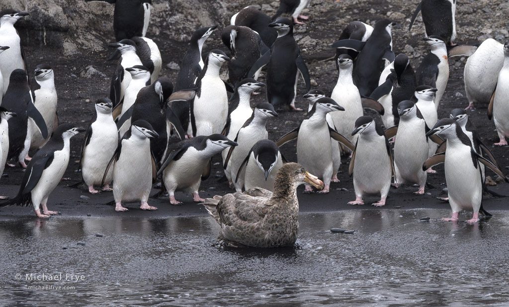 As we watched, we saw an immature petrel hunting penguins, so we tried to photograph this behavior. (Immature giant petrels are all brown, while adults are brown and white.) The photograph above shows this petrel chasing a chinstrap into the water (it didn’t catch it). The petrel walked up and down the beach, sometimes chasing after penguins, but with no success while we watched it. As the petrel patrolled the beach, penguins began to “mob” it, gathering around it and trying to chase it away, as you can see in this next image:
