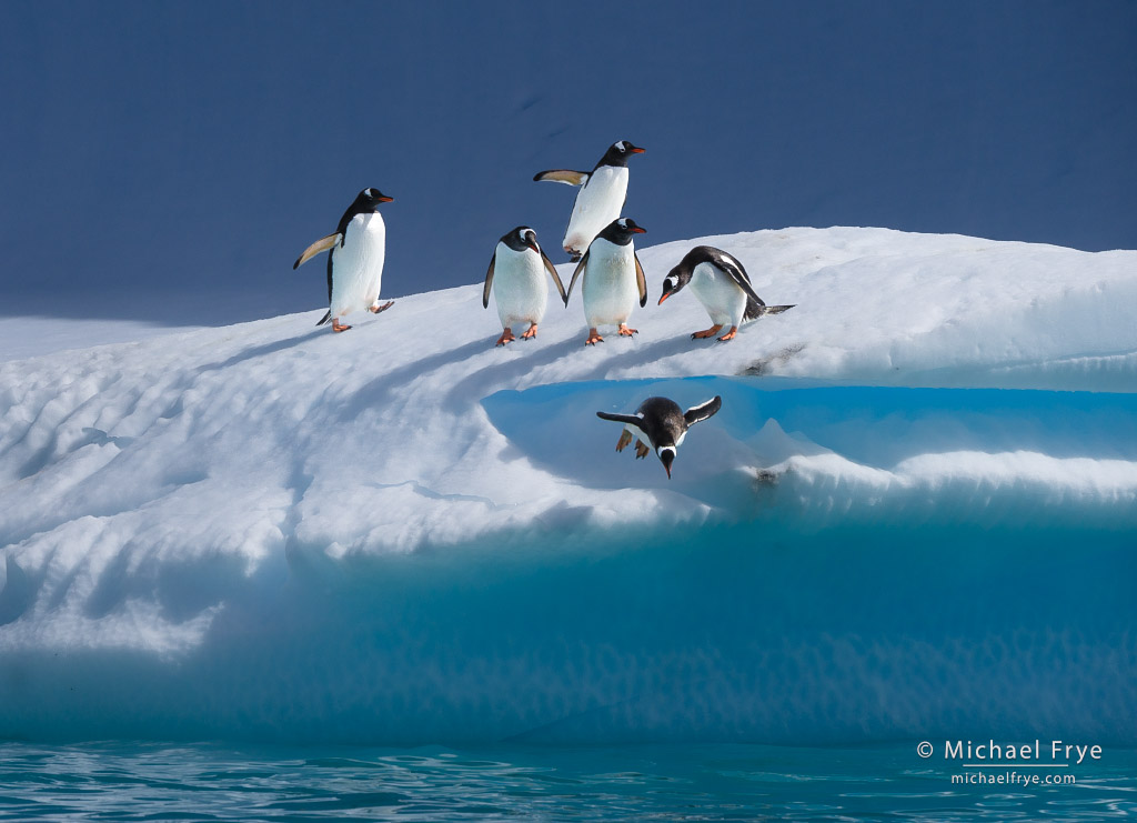 Gentoo penguins diving off an iceberg, Antarctica. 400mm, 1/1500 sec at f/16, ISO 250.