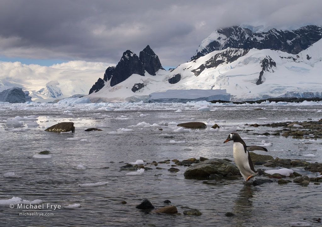 Gentoo penguin with mountains and glaciers, Antarctica. 64mm, 1/500 sec at f/16, ISO 500.