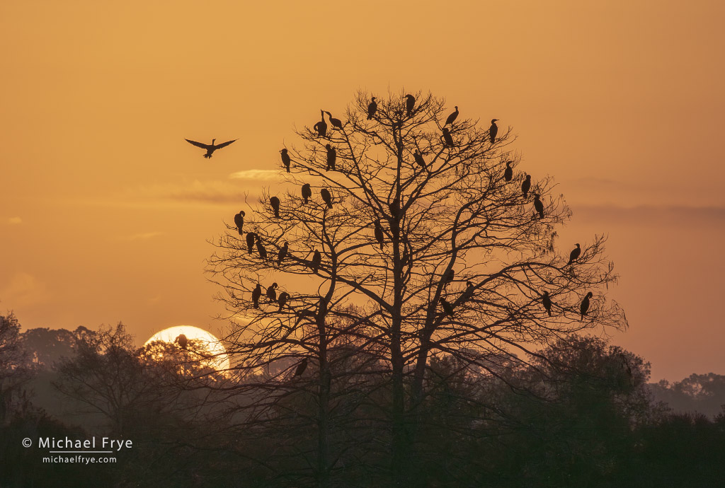 Double-crested cormorants roosting in a tree at sunrise, Florida. Seeing this tree full of roosting cormorants with the sun rising behind them, I realized this was a great opportunity to show birds and some of the Florida habitat with dramatic light. 400mm, 1/1000 sec. at f/11, ISO 100.