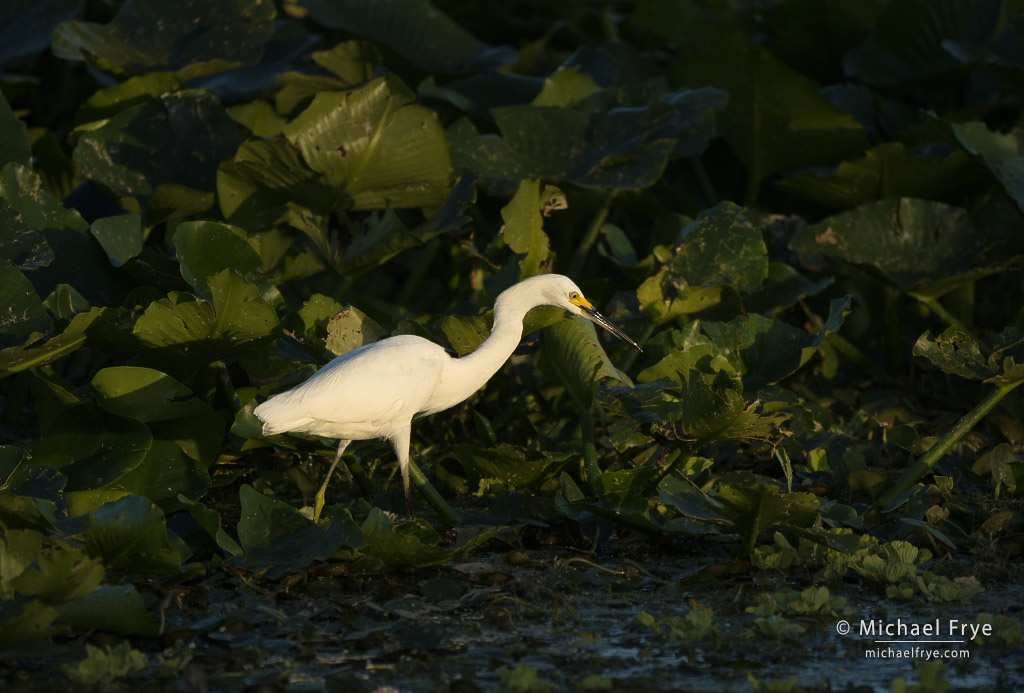Snowy egret hunting through pond lilies in a Florida marsh. The chiaroscuro light created some drama here, with the pond lilies showing a small slice of characteristic habitat. 400mm, 1/2000 sec. at f/5.6, ISO 640.