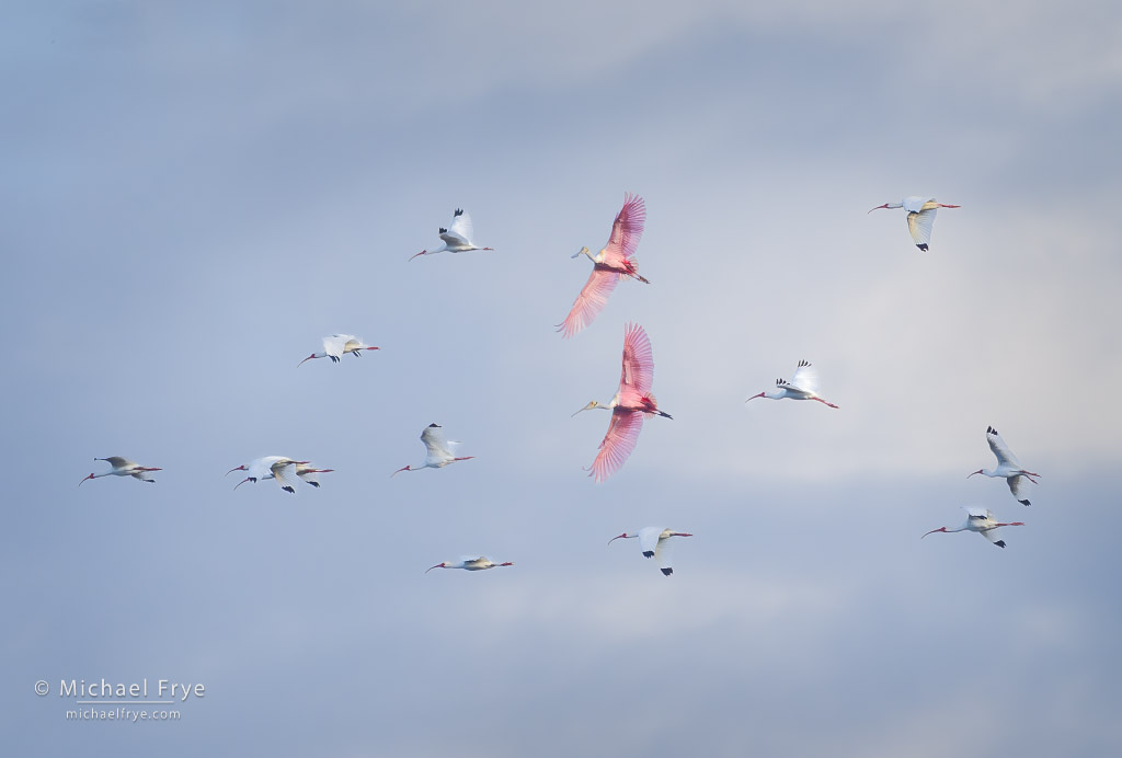 White ibises and roseate spoonbills, Florida. I noticed this flock of white ibises, focused on them, and then two spoonbills banked and joined the flock at just the right moment. 391mm, 1/1500 sec. at f/5.6, ISO 1250.