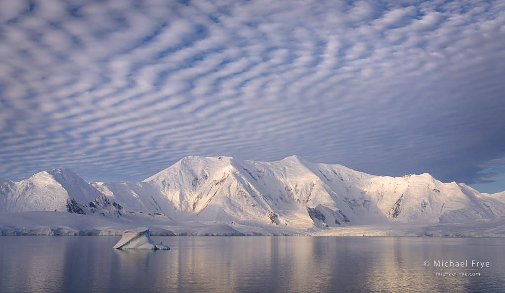 Ice-covered mountains under a mackerel sky, Antarctica. 37mm, 1/125 sec. at f/11, ISO 100. (This was actually photographed from land, with a tripod.)