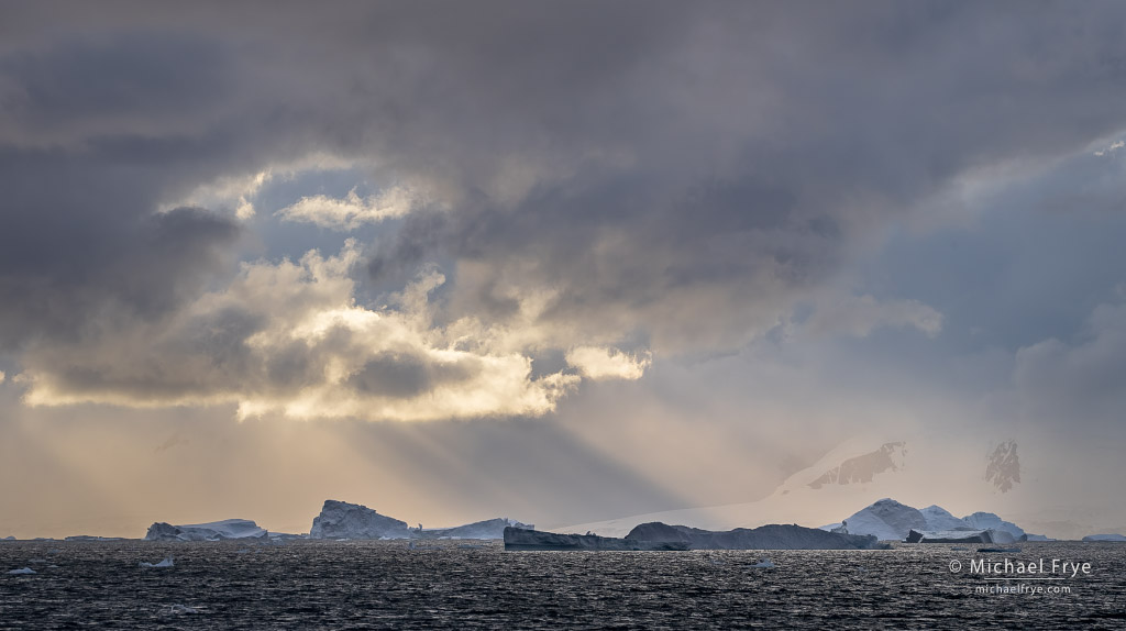 Icebergs and sunbeams, Antarctica. This was a handheld bracketed sequence – three shots, two stops apart. I used Lightroom’s HDR merge with “Auto-Align” checked to blend the three exposures, and it worked perfectly. 244mm, shutter speeds from 1/250 sec. to 1/4000 sec. at f/16, ISO 320.