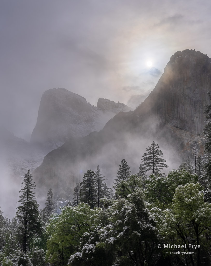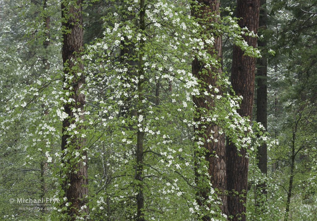 After photographing dogwoods for a while I noticed sunlight hitting the cliffs, so I tore myself away from the dogwoods and looked for a wider view. I ended up along the Merced River, where I could see mist and light on El Capitan, and a dogwood in the foreground (the photograph at the top of this post). This dogwood didn’t have much snow on it, so the blossoms stood out, but other trees in the middle ground still had a coating of snow. That combination worked well to convey the idea of a spring snowfall.