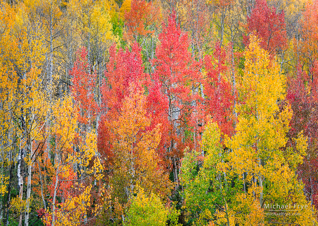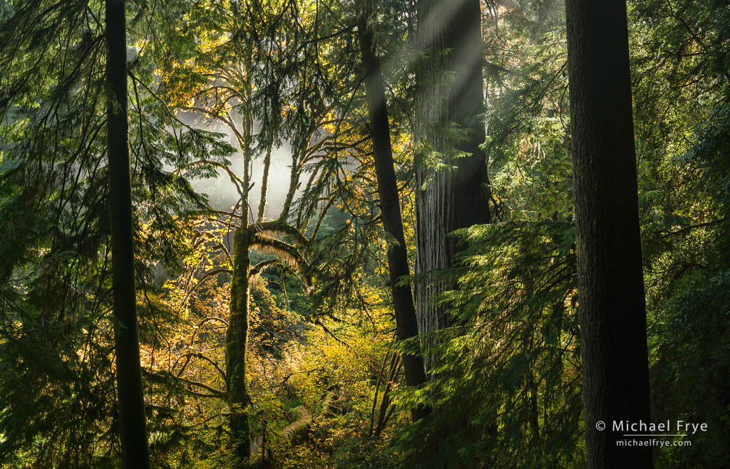 I had long wanted to photograph fall color in the redwoods, but it’s difficult to find the right conditions, especially since the best groves are a nine-hour drive from home. Some years the big-leaf maples just turn brown. And even if they do turn yellow the timing is highly variable. So we felt very lucky to find some good color this year.