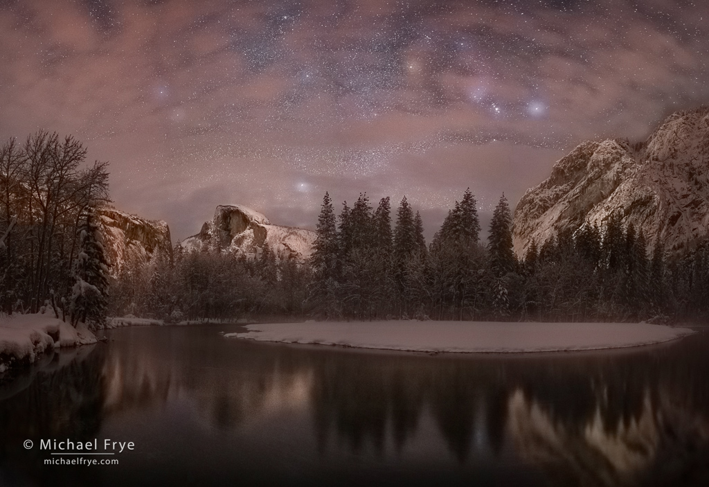 I made this photograph on a magical, misty, snowy December night in Yosemite two years ago. I loved the pattern of clouds, with Orion poking through. It was such a beautiful night – but cold! I hope you’re someplace warmer tonight.