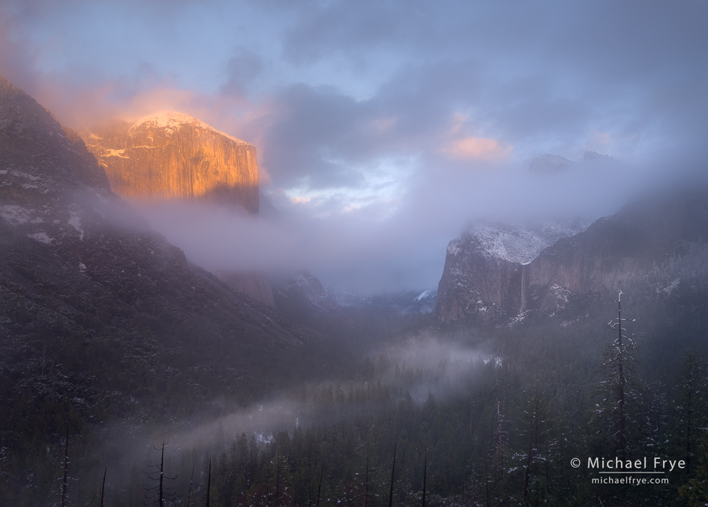 Last Tuesday night a small snowstorm moved through Yosemite. It’s been a dry winter so far, and this was the first significant snow in Yosemite Valley in quite awhile. It also looked like the storm might clear around sunrise, which was good timing.