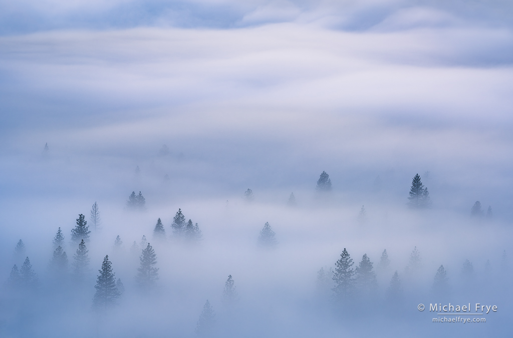And there was lots of mist when I arrived in the valley. I climbed up to one of my favorite off-the-beaten path viewpoints, thinking to capture a classic Yosemite clearing storm. But when I reached that spot it became apparent that the mist wasn’t wrapping around the cliffs as I’d expected. Instead, I saw a shallow layer of fog covering the length of the Valley floor, with the tops of tall ponderosa pines poking up through the fog layer. Which looked gorgeous.