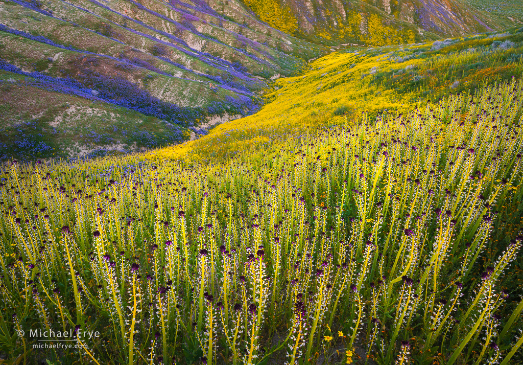 But meanwhile, all the winter rains in California had spawned an exceptional spring wildflower bloom, which we definitely wanted to see. So from early March to late April, sandwiched around our Death Valley workshop, and juggled with other events and projects, Claudia and I traveled to Antelope Valley, Anza-Borrego Desert State Park, and various locations in California’s Central Coast ranges.