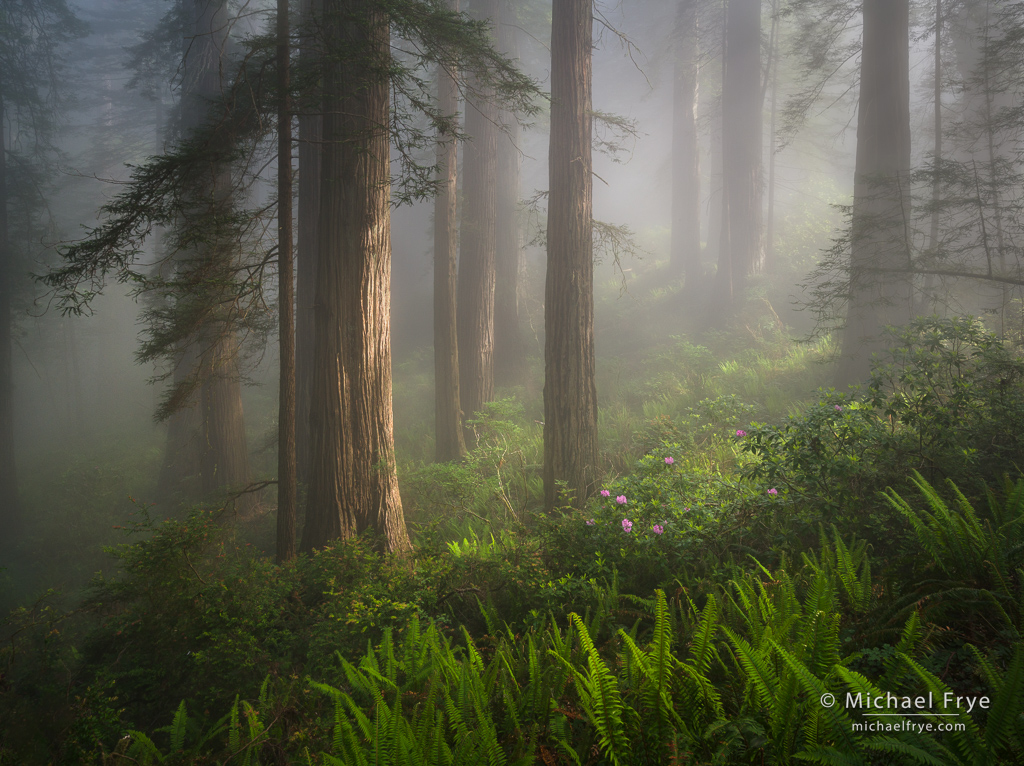 Redwoods, ferns, and rhododendrons, northern California coast. I’ve photographed sun breaking through fog in redwood forests many times, but it’s always a special treat. At this particular moment the sun highlighted the redwood trunk on the left, providing a visual focal point, with the ferns, rhododendrons, other trunks, and patches of sunlight all arranging themselves in a harmonious way. I consciously planted the tripod at a spot where I could see decent spacing and separation between the trunks.