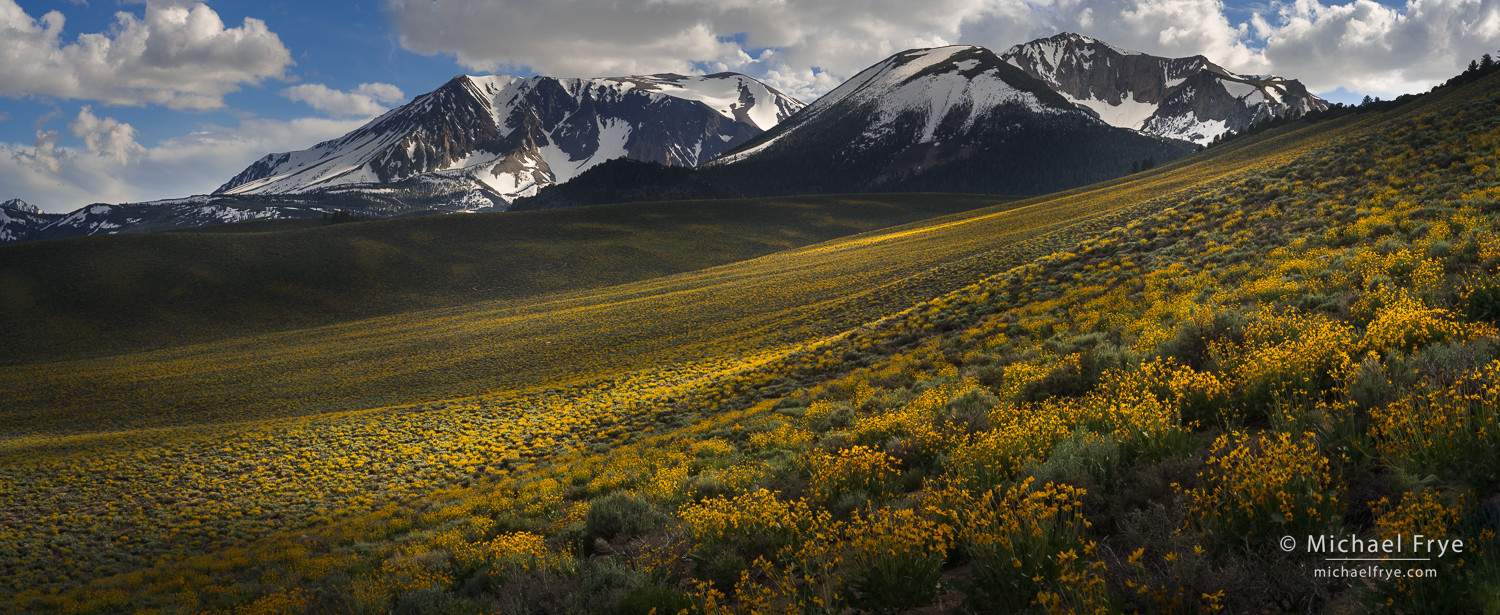 Fields of arrowleaf balsamroot below Sierra peaks, Inyo NF, California. It was a bit of a grunt to climb up this hill through the sagebrush, but I thought this higher vantage point would allow me to see a succession of layers from foreground to middle ground to background, which could add more depth to the image. The dappled light and clouds were perfect complements to the scene. This is a stitched panorama (three shots), made quickly to capture fleeting light. 50mm, 1/125 sec. at f/16, ISO 100.