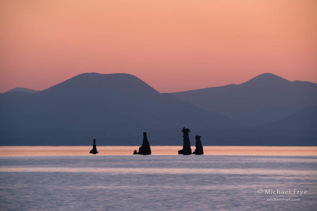 Tufa formations and osprey at sunrise, Mono Lake, California