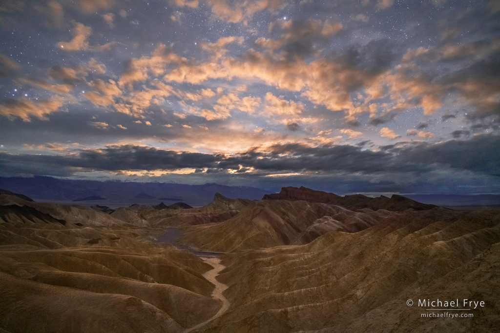 The night after the rainstorm cleared during our recent visit to Death Valley, the half-full moon was due to set around midnight, and I thought there might be an opportunity to photograph an interesting moonset if the clouds lingered.