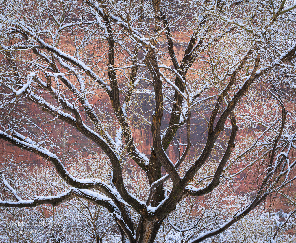 After escaping Mariposa’s snowmageddon, and spending a few days in Death Valley, Claudia and I decided to head for Zion. I’d never photographed Zion with snow, and snow was in the forecast. Well maybe. We drove there on a Monday, and it looked like some higher elevations could get a dusting of snow Monday night, followed by a more substantial storm, with colder temps, on Tuesday night. The question was whether it would be cold enough to snow on the floor of Zion Canyon. That seemed iffy, but odds were decent enough to make it worth trying.