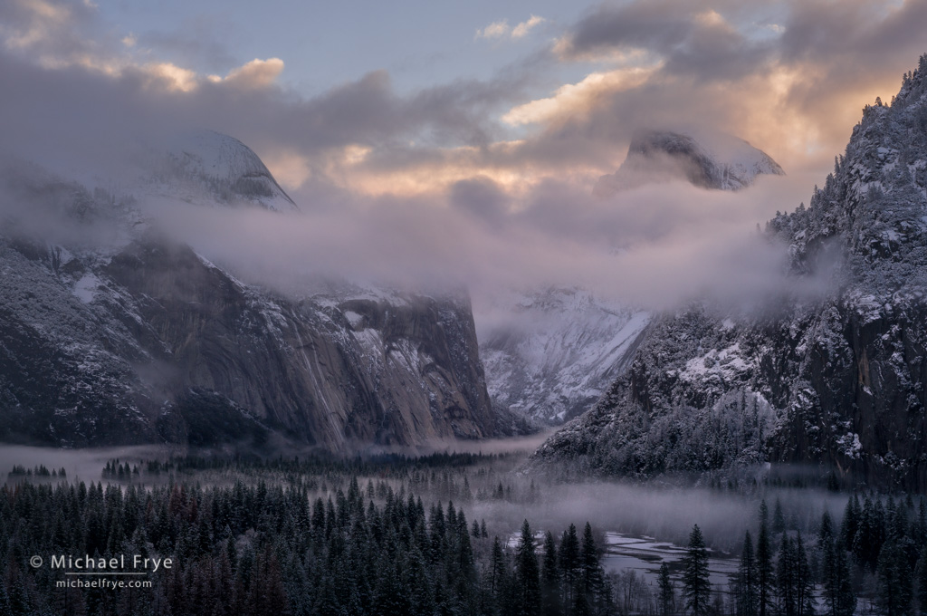 Half Dome, North Dome, and Yosemite Valley at sunrise. I made this image after a light snowfall – accompanied by some beautiful mist – in 2017.