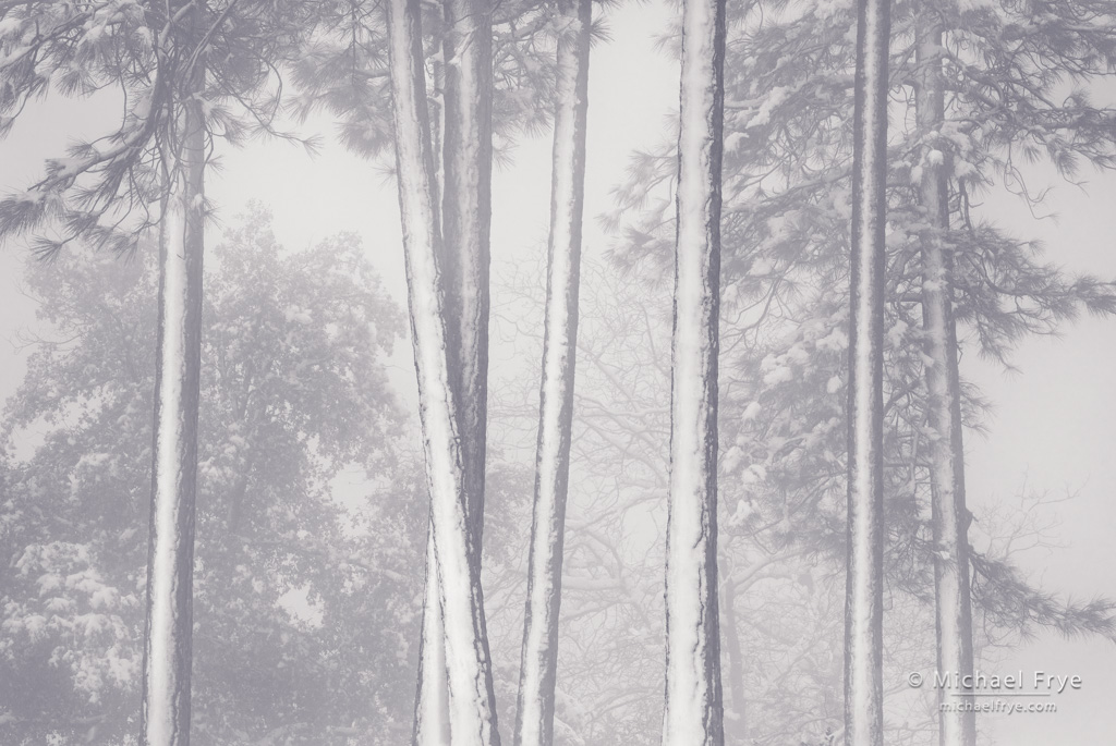 Snow-covered pines, Mariposa County, California. I found some snow-plastered trees in the fog as the storm was clearing.