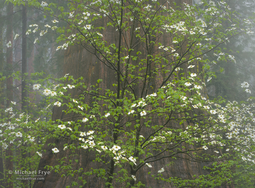 Dogwood and giant sequoia in the fog, Sierra Nevada, California. Fog is a wonderful complement to forest scenes; here, some ephemeral fog lasted just long enough for me to capture this image. 70mm, polarizer, 0.7 seconds at f/16, ISO 100.